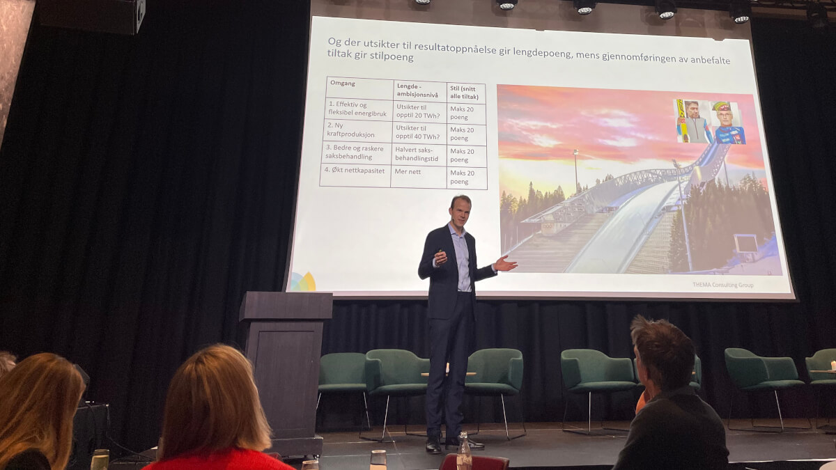 Svend Boye brukte skihopping som analogi for å vurdere hva som har skjedd med Energikommisjonens anbefalinger det første året: Lengde for oppnådd mål og stilkarakter for innsats.