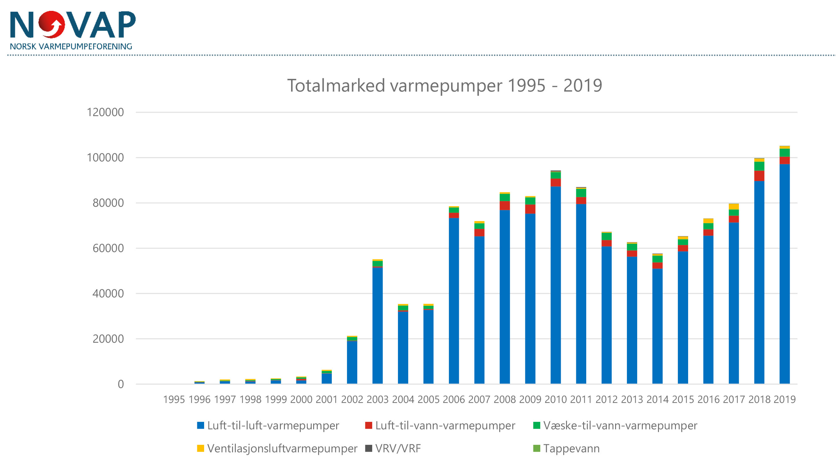 Totalmarkedet for varmepumper til og med 2019.