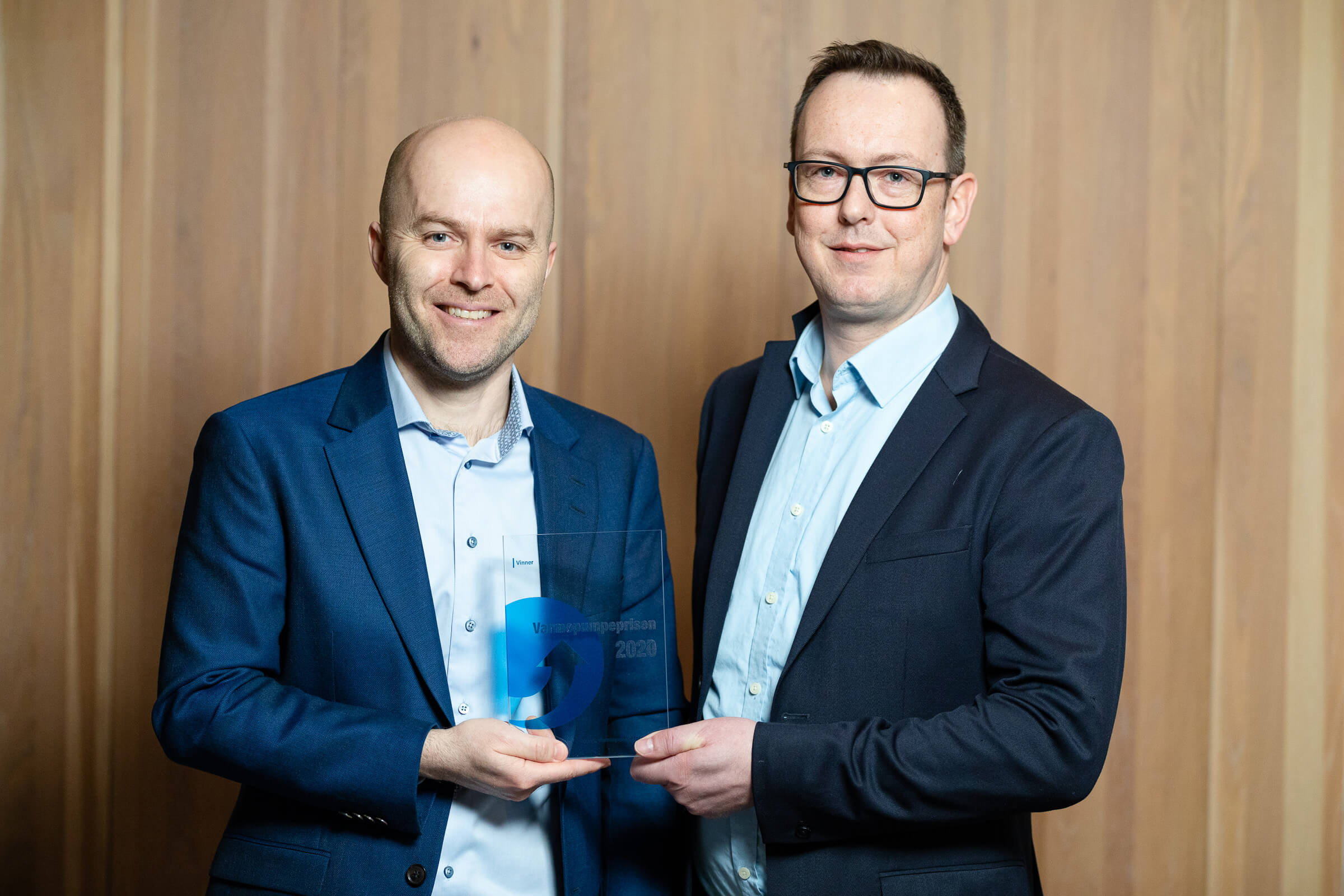 – Det stort å få en slik anerkjennelse fra bransjen. Dette inspirerer til å fortsette å lete etter nye og gode løsninger. Tusen takk, sier prisvinner Martin Kapskarmo (til høyre) med Rolf Iver Mytting Hagemoen.