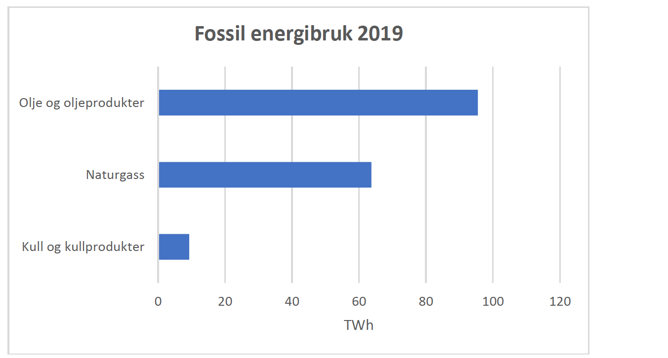 Fossil energibruk i Norge i 2019. Kilde: SSB. Tilgang og anvendelse av energi i Norge etter energiprodukt, Energibalanse. TWh.